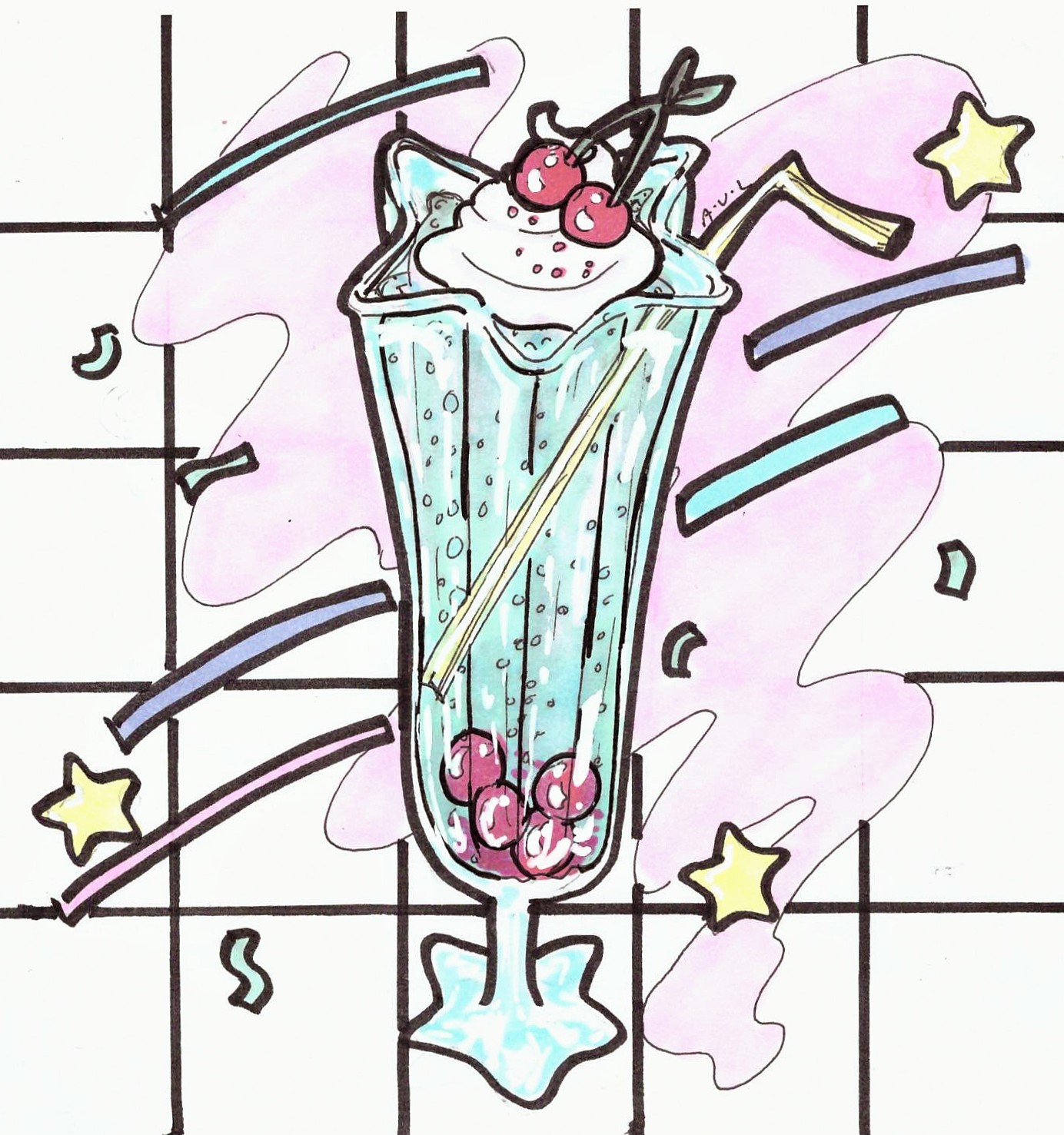 Part of my Soda Float series. A 5" x 5.5" sweet cherry mint soda print on cardstock of a magical, fantastic 80s style fizzy treat!