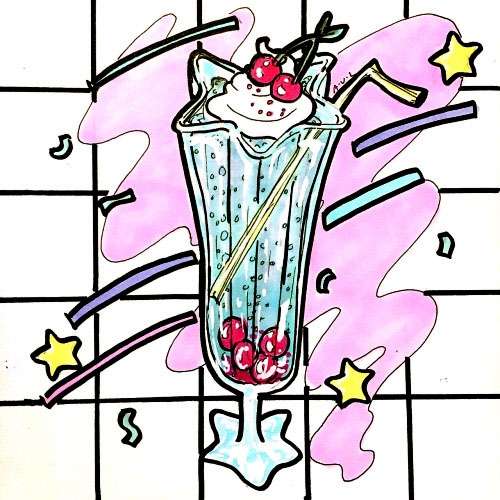 All four 5" x 5" prints in the Soda Float series. 4 sweet fizzy prints on stickers of magical, fantastic 80s style fizzy treats!